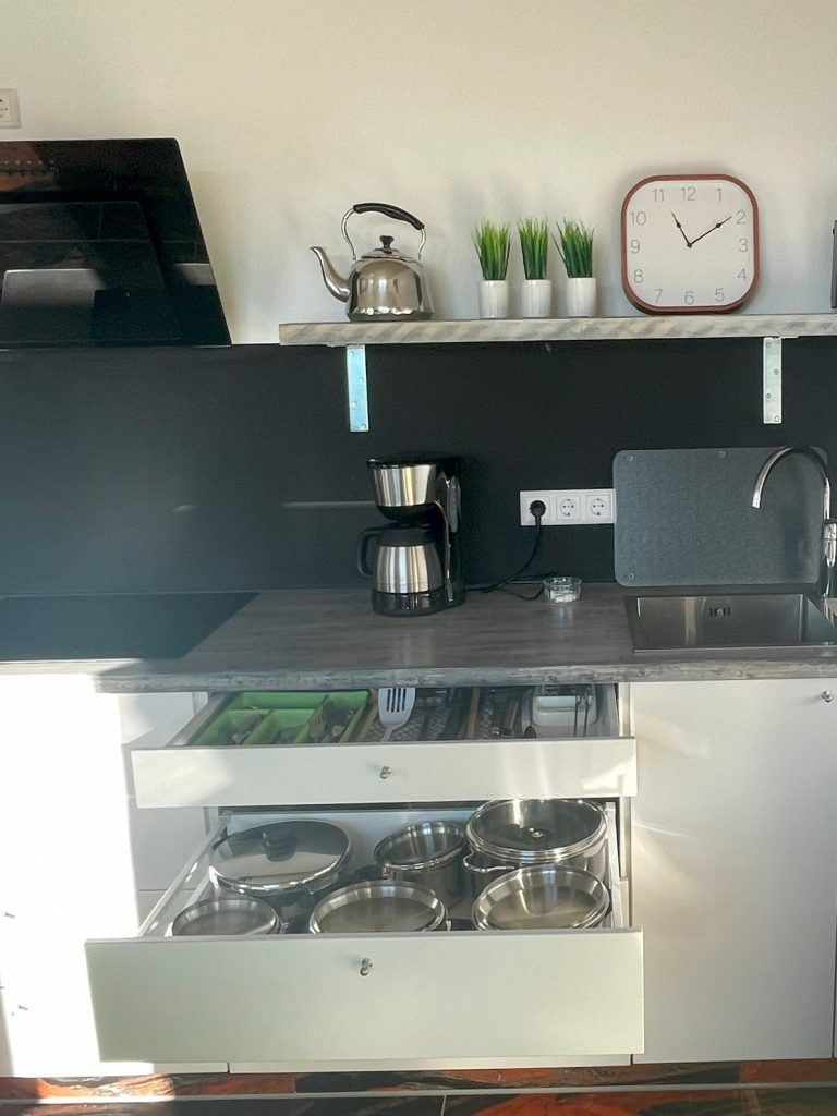 gut ausgestattete Küche mit E-Herd, Mikrowelle, Kühlschrank mit Eisfach, Elektrogrill, Toaster, Kaffeemaschine und natürlich Töpfen, Pfannen, Geschirr usw.